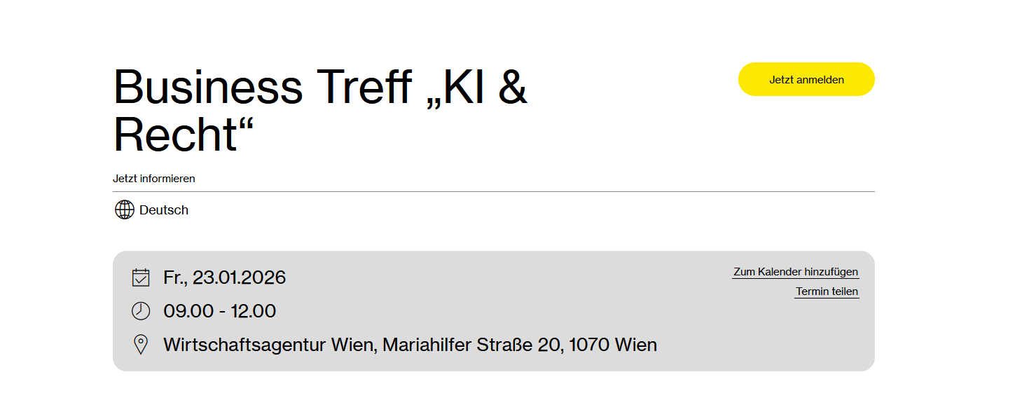 Künstliche Intelligenz gewinnt in unternehmerischen Entscheidungsprozessen zunehmend an Bedeutung und wirft gleichzeitig neue rechtliche Fragestellungen auf. Der Business Treff „KI & Recht“ bietet einen kompakten und praxisnahen Überblick über zentrale rechtliche Rahmenbedingungen beim Einsatz von KI im Unternehmenskontext.